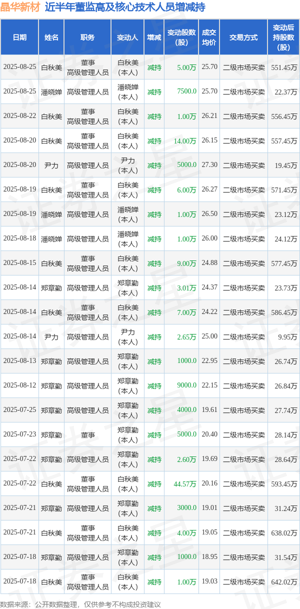 晶华新材近半年内的董监高及核心技术人员增减持详情如下: