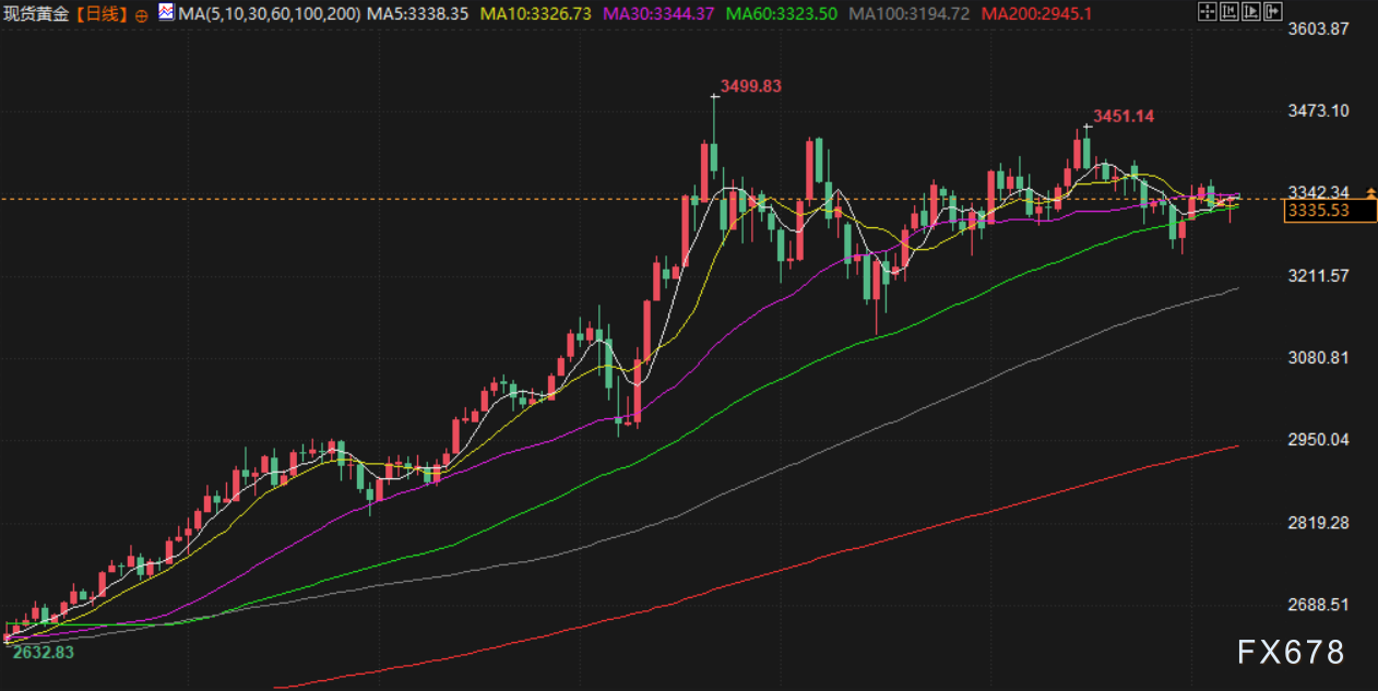 受美元走强影响,现货金稍早下跌超过1%,现货金报每盎司3332.62美元,下跌0.1%。美国期金变化不大,报收于 3342.8 美元。